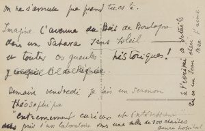 « On ne s’amuse que quand tu es là. Imagine l’avenue du Bois de Boulogne dans un Sahara sans soleil et toutes ces gueules historiques ! [y compris H. de Régnier biffé] Demain vendredi je fais un sermon théosophique “extrêmement curieux et intéressant” près d’un laboratoire dans une salle de 100 chaises genre hôpital. Je t’écrirai des détails. Tu es un Jean chéri. Max t’aime ».