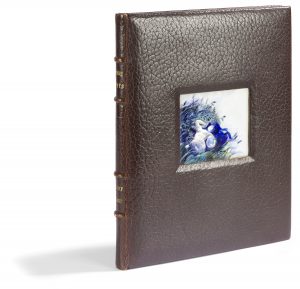 d’aquarelles sur vélin fort intercalés dans le texte, le tout relié en un volume petit in-4 (28,5 x 22 cm) plein maroquin tête de nègre, plaque d’émail encastrée au centre du plat sup. (8 x 9 cm), dos à quatre nerfs avec titre doré, encadrement intérieur de même maroquin orné d’un double filet doré avec monogramme VIA dans les coins, doublures et gardes de moire bleu-vert, doubles gardes, tranches dorées., étui bordé (G. Cretté succ. de Marius Michel).