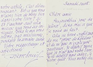 « Aujourd’hui jour de jeûne, dites-moi ce que je vous ai fait. Cela ne vous suffit pas de me “priver de dédicace” et de ne pas m’expliquer pourquoi. Je dépéris parce que je n’ai pas votre livre. Je ne dépéris pas assez, à votre goût. Vous mettez du raffinement dans vos supplices et […] vous me mettez de force sous les yeux de ce matin un article… mais un article. Eh bien je n’en ai lu que vingt lignes de votre article et je me suis arrêté. Je suis morose depuis deux mois. Je ne voulais pas tomber de là dans la mélancolie, de la mélancolie dans la tristesse, de la tristesse dans le chagrin, du chagrin dans la neurasthénie, de la neurasthénie dans l’hypocondrie et de l’hypocondrie dans les résolutions désespérées. Elles sont trop bien les vingt premières lignes de votre article. C’est décourageant. Est-ce que vous n’avez rien de moins bien dans votre livre ? Si. Et l’auteur sait cela mieux que les critiques. Dites-le moi vous-même, par miséricorde, pendant la semaine sainte »…