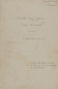 Sur la page de titre, outre la mention « Manuscrit unique », Paul Morand a noté : « Ces vingt cinq poèmes ont paru en 1924 en édition originale au Sans Pareil ».