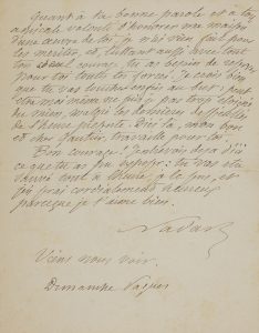 « Assurément oui, mon brave et bon Gautier, je ferai tout pour aller à ton exposition et même à la vente, malgré les tentations que je me sais d’avance et qui me seront d’autant plus douloureuses devant les strictes nécessités qui me forcent de m’abstenir devant ce que j’aime le plus. Mon regret sera doublé de ne pouvoir accomplir mon devoir élémentaire d’ami en poussant à ta vente, et ce sera un châtiment de plus des folies et des témérités de ma vie passée, que j’ai tant de mal à réparer depuis quelques années.