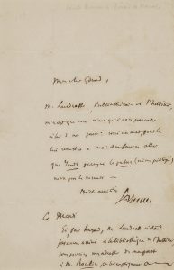 « M. Landresse, bibliothécaire de l’Institut, m’a dit que vous n’avez qu’à vous présenter à lui de ma part : voici un mot, pour le lui remettre. Mais il ne faudrait aller que jeudi parce que le public (même privilégié) ne va pas le mercredi. […] Si, par hazard, M. Landresse n’était pas encore arrivé à la bibliothèque de l’Institut, vous pourriez vous adresser de ma part à M. Roulin, en lui expliquant »…