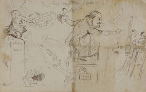 1. DEUX DESSINS à l’encre brune au recto et verso d’un feuillet oblong in-8 (13,2 x 20,5 cm, fentes réparées), intitulé Bis repetita placent, [1873]. – Recto : à gauche, buste de Lazare Hoche au grand nez disant dans une bulle « De moins en moins question de moi ! Oùsqu’est mon sabre, de plus en plus !!! » ; au pied du buste, panier rempli de bouteilles de Champagne frappé. Au centre du dessin, GAMBETTA debout sur une chaise fait un « Discours » (marqué sur une bulle s’échappant de son derrière), tenant un coq dans sa main gauche (qui crie dans une bulle « Nommez Coquelin ! ») ; sous le fauteuil un personnage écrasé (bulle « nommez p’ti’Jeanne, na ! ») et un encrier (avec étiquette « il a rendu l’encrier » et bulle « nommez Laboulaye ! »). À droite, des gens attablés, avec légende « Centre gauche. Discours » ; sur la table, une bouteille a les traits de Thiers et est marquée « liqueur au patria ». – Verso : caricature de THIERS appuyé sur des béquilles, devant sa maison (panneau Place George), tenant un gros sac (marqué 1.000.000, une chaumière et un cœur). À ses pieds, MAC-MAHON, coiffé d’un bicorne, montre sa tête ; commentaire : « Pour moi je commence à envisager [flèche vers la tête] celle-ci, de branche sans trop d’horreur, à défaut de celle-là », une grande flèche pointant un drapeau fleurdelysé et marqué H V (aux coins : Alsace, Lorraine, Algérie, La Logique). En haut, entourant Thiers, paroles de chansons : « Chœur radical. Dansons la rédingotte / Vive le son, vive le son, / Dansons la rédingotte / Vive le son du picton », et « Chœur centre gauche. Viv’l’libérateur (bis) / C’esst le cri de la France / Il fut son sauveur Il est son espérance !!! »… Dans le bas de la page, ces deux notes : « Pardon de la confusion des présents Jeanboudommer, mais, vrai, la situation y prête – et même y donne ! » ; et « Serait-ce là – grands Dieux – la branche de ton scepticisme, à toi aussi ?? ».