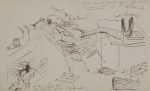 9. DESSIN à l’encre brune avec légendes autographes, Ça c’est ma nouvelle incarnation, envoyé à Ernest Delahaye, [22 mai 1885 ?] (13,2 x 11,8 cm). Verlaine se représente devant le Panthéon portant le cercueil de Victor Hugo sous le bras, devant une bouche d’égout ouverte, disant dans une bulle « Un peu moisie la caisse. Coulant, le macabé ! » Sa jambe gauche est marquée jambe en stuc, et sa canne mon souteneur. En bas à droite est inscrit : « Après les Panthéons et les cérémonies Voici (dirait madame Esnault) les gémonies ! » [Victor Hugo a été enterré en grandes pompes le 22 mai 1885 ; Mathilde Mauté, qui avait obtenu le divorce, assistait aux obsèques ; Hugo avait essayé en vain de réconcilier le couple.] (Correspondance générale, p. 900).