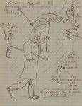 7. DESSIN à l’encre brune avec légendes autographes, envoyé à Ernest Delahaye, [vers le 6 juin 1881] (13,2 x 10,8 cm), autoportrait de Verlaine commenté. Verlaine s’est représenté chaussé de patins à glace, tenant un parapluie ouvert, un râteau sous le bras, et coiffé du « chapeau de paille traditionnel », marchant dans la pluie sous « le soleil khroumirisé par le bonhomme Noël », avec des commentaires sur le mauvais temps en juin : « Les Travaux et les jours. Juinard », et après une citation du Tarare de Beaumarchais : « Si ça continue, on ira en patinant, dans les vertes prairies » (Correspondance générale, 81-10).