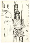 8. DESSIN original à l’encre noire, [février 1884 ?] (19,5 x 13,2 x cm) représentant François COPPÉE en soldat montant la garde devant une guérite marquée Palais Royal, avec cette note autographe sur la droite : « Vive à jamais François Coppée, Vivent ses vers ... et son Épée ! » [François Coppée a été élu à l’Académie française le 21 février 1884.]