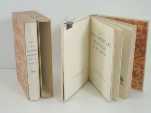 LES CENT NOUVELLES NOUVELLES DU ROI LOUIS XI, UNION LATINE D'EDITIONS 1956. 1 DES 1000 SUR VELIN. Illustration de ANDRE HUBERT. 2 volumes, tête or, plein parchemin titre et fleur de lys au dos, étui.