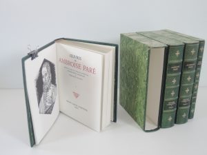 OEUVRES DE AMBROISE PARE remise en ordre et en Français moderne par ROGER-HENRI GUERRAND ET FERNANDE DE BISSY, UNION LATINE D'EDITIONS 1976. 4 volumes, tête or, reliure éditeur, plein mouton maroquiné, plats estampés à froid, titre or et...