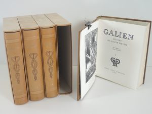 GALLIEN, EPITOME EN QUATRE PARTIES, UNION LATINE D'EDITIONS 1962. Illustré de gravures sur bois de JEAN CHIEZE. 4 vol, reliure d'éditeur en pleine bas, tête or, dos orné, plats décorés de signe du zodiaque, étui.