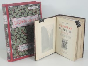J.B. AUBRY, LES CHINOIS CHEZ EUX, SOCIETE SAINT AUGUSTIN 1887. 1 vol, bon cartonnage d'éditeur, nombreuses illustrations. JOINT : ELISEE ET ONESIME RECLUS, L'EMPIRE DU MILIEU, HACHETTE 1902. 1 vol demi bas, titre or. Reliure usagée. Les cartes...