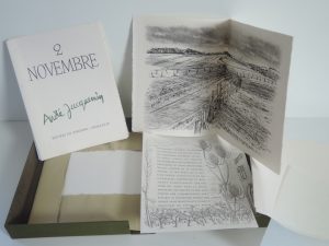 MAURICE BARRES, ANDRE JACQUEMIN, 2 NOVEMBRE, ALEXANDRE DE TARTAS, MOULIN DE VAUBOYEN 1979. in folio, 91 p, 52/80 sur vélin. Eaux fortes de ANDRE JACQUEMIN, couv rempliée avec gaufrage (chardon). En feuilles dans un coffret toilé, titre au dos et...
