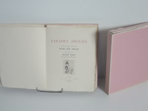 PARADES ABOLIES, IMPRESSIONS FORAINES DE PIERRE MAC ORLAN, PARIS, 1944-1948. Aquarelles de ROGER WILD. In folio, 50 p, 162/282 sur Auvergne En feuilles sous couv rempliée. Étui chemise, titre sur pièce de papier.