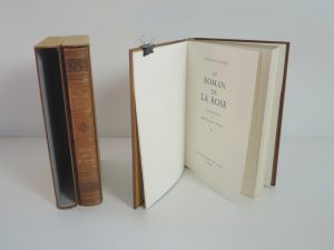 LE ROMAN DE LA ROSE, GUILLAUME DE LORIS, JEHAN DE MEUG ,EDITIONS DE L'IBIS, PARIS 1981-1982. ILLUSTRATIONS DE JEAN FRANCOIS MINCET. 2 vol in folio, 265/861 sur vélin. RELIURE EDITEUR EN PLEINE BAS, TETE OR, SUR LES PLATS PLAQUE ESTAMPEE A FROID, AU...