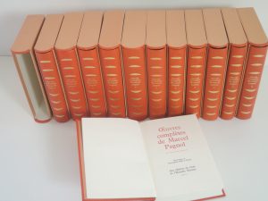 OEUVRES COMPLETES DE MARCEL PAGNOL, CLUB DE L'HONNETE HOMME 1977. ILLUSTRATIONS DE BONCOMPAIN, MUHL ET PALAYER. 12 vol in8°, 296/6000 sur vergé. Reliure éditeur, tête or, pleine peau maroquinée, plats et dos ornés, titre or.