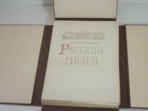 LES TRESORS ARTISTIQUES DE L'U.R.S.S., LE MUSEE D'ETAT DE L'ART RUSSE, MOSCOU 1952. 86 REPRODUCTIONS D'OEUVRES DE PEINTRES RUSSES D'AVANT LA REVOLUTION. CONCEPTION DE L'ALBUM A. SAVINOV, TABLE. DANS UNE CHEMISE A RABATS EN TOILE AVEC TITRE. BON ETAT.