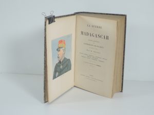 LA GUERRE A MADAGASCAR, histoire anecdotique des expéditions Françaises de 1885 à 1895, PARIS, sd. Nombreuses illustrations en couleur par L. BOMBLED. 1 vol in 4°, 960 p. DEMI BAS, TITRE ET DOS FILETE.