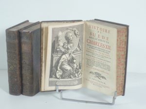 HISTOIRE DE SUEDE SOUS LE REGNE DE CHARLES XII par M. DE LIMIERS à AMSTERDAM chez les JANSONS 1721. 3 vol in 12, xlvi, sommaire, catalogue, 414 p, 414 p, 422 p. Complet du frontispice, des cartes, des figures et des portraits. PLEINE BAS, DORURE...