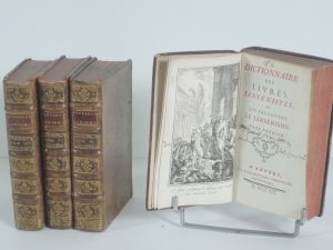 DICTIONNAIRE DES LIVRES JANSENISTES ou QUI FAVORISENT LE JANSENISME par le PERE COLONIA, ANVERS chez JEAN – BAPTISTE VERDUSSEN 1752. 4 vol in 12, frontispice, xx, 508 p, 552 p, 504 p, 467 p, compris table des auteurs. PLEINE BAS, TITRE SUR PIECE,...