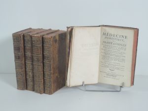 MEDECINE DOMESTIQUE OU TRAITE COMPLET des moyens de se conserver en santé, de guérir et de prévenir les maladies... par GUILLAUME BUCHAM, PARIS, DESPREZ 1780 5 vol, in4, frontispice, cviij, 391 p, 516 p, 632 p, 597 p, 591 p. PLEIN VEAU MARBRE,...