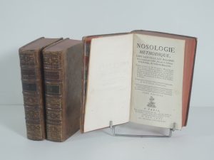 NOSOLOGIE METHODIQUE DANS LAQUELLE LES MALDIES SONT RANGEES PAR CLASSES SUIVANT LE SYSTEME DE SYDENHAM ET L'ORDRE DES BOTANISTES, traduite du latin par M.FRANCOIS BOISSIER DE SAUVAGES, PARIS, HERISSANT 1771. 3 vol in 8°, xl, 800 p, viij, 759 p, 608...