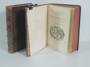 HISTOIRE DU CONCILE DE CONSTANCE par JACQUES LENFANT, AMSTERDAM, chez PIERRE HUMBERT 1727. 2 vol in 4°. TOME 1, lxviii, 609 p, frontispice, belle vignette sur la page de titre, 14 portraits. TOME 2, 552 p, table, 5 portraits, 15 pages sont...