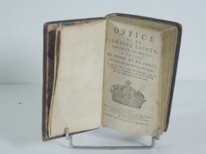 OFFICE DE LA SEMAINE SAINTE, LATIN ET FRANCAIS A L'USAGE DE ROME ET DE PARIS, GREGOIRE DUPUIS A PARIS 1726. in12, 723 p, frontispice et trois gravures de VIEUGELS. PLEIN MAROQUIN, TRANCHE OR, TITRE ET DOS ORNE. EXEMPLAIRE AUX ARMES ROYALES.