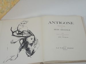 JEAN ANOUILH, ANTIGONE, PARIS, LA TABLE RONDE 1945. ONZE LITHOGRAPHIES DE JANE PECHEUR. In 4°, 132 p, 142/400 sur vélin. EN FEUILLES SOUS COUV IMPRIMEE ET REMPLIEE. CHEMISE AVEC TITRE, ETUI.