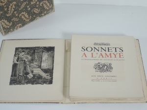 SONNETS A L'AMYE, (BRANTOME, RONSARD, DU BELLAY...), PARIS 1945. ILLUSTRE DE 32 LITHOGRAPHIES DE CLUSEAU-LANAUVE. in 4°, 64 p,tiré à 175 exemplaires, celui-ci porte la lettre H, exemplaire de collaborateur, avec une suite en fin de vol. EN...