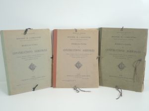 MODELES TYPES DE CONSTRUCTIONS AGRICOLES, librairie de la construction moderne, PARIS sd. FERMES, GRANGES, ETABLES, ECURIES, BERGERIE… 57 modèles avec plans et croquis dans trois chemises à rubans.
