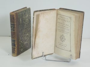 PRECIS DU SIECLE DE LOUIS XV PAR M. VOLTAIRE, GENEVE 1769. 2 vol in 12, 299 p, 250 p demi bas, titre et tomaison sur pièce. Manque les coiffes pour le tome un, frottements.