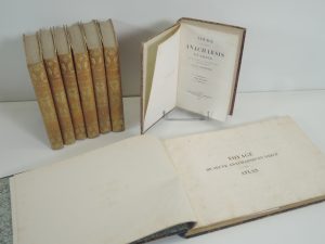 VOYAGE DU JEUNE ANACHARSIS EN GRECE par J.J. BARTHELEMY, PARIS, CHEZ PHILIPPE 1837. 7 TOMES + ATLAS. In 4°, 433 p, 473 p, 448 p, 458 p, 449 p, 409 p, 428 p, ATLAS, 18 p, 37 planches. DEMI BAS, TITRE ET TOMAISON, DOS ROMANTIQUE, ATLAS DEMI TOILE...
