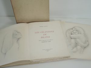 PIERRE LOUYS, LES CHANSONS DE BILITIS, G.GUYOT 1948. 20 pointes sèches de MARIETTE LIDYS .En feuille sous couverture rempliée. Bon état intérieur, étui chemise usagé avec titre au dos.