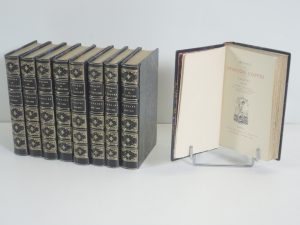 OEUVRES DE FRANCOIS COPPEE, POESIES,1864-1905, 6 vol, THEATRE, 1869-1895, 3 vol, PARIS ALPHONSE LEMERRE 1878. 9 vol, in12, tête or, demi bas à coins, titre or en deux pièces, dos orné, filets or mors et coins. Bon état.