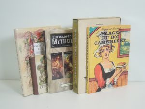 VARIA : DIVERS LIVRES, images du roi Camembert, encyclopédie de la mythologie, la grande encyclopédie des lutins, COLLODI, PINOCCHIO, (en italien), les jeux du temps passé (complet des notices)