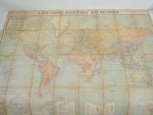 CARTES TARIDE, PLANISPHERE, LES CINQ PARTIES DU MONDE COMPRENANT TOUTES LES POSSESIONS COLONIALES. IMPRIMEE ET GRAVEE PAR CHARAIRE. 126 X 94 ENTOILEE. PAPIER JAUNI.