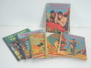 WALT DISNEY, MICKEY ET SON NAVIRE, 1949. TARZAN TRAHI, N°5 1938, TARZAN L'INVINCIBLE, N°14 1949, TARZAN ET LE PROSCRIT, N°15 1950, TARZAN ET LES AVENTURIERS, N°17 1951, LES CHASSES DE TARZAN, N°18 1951. CARTONNAGE USE.