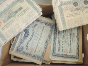 1 CARTON D'ACTIONS : SOCIETE DEWATEX, COMPAGNIE GENERALE DES TABACS, ASTRA ROMANA, MANUFACTURE DES ENGRAIS NOVO, PARIS FONCIER.