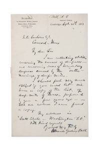 « I am collecting statistics concerning the causes of deafness – and concerning cases of hereditary deafness caused by the inter-marriage of deaf-mutes. I should feel very much obliged if you could let me have a copy of the list of deaf-mutes of Mass. prepared by you a few years ago »… Il recueille des statistiques relatives aux causes de la surdité, et des cas de surdité héréditaires occasionnés par le mariage de sourds-muets. Il prie de lui communiquer une copie de la liste des sourds-muets du Massachusetts – liste préparée par Sanborn quelques années plus tôt – ou de lui dire où il peut en trouver une. Son adresse est « Scott Circle – Washington D.C. »…