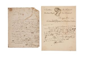 GEOFFROY SAINT-HILAIRE ÉTIENNE (1772-1844) NATURALISTE. 2 L.A.S., Paris 1832-1834 ; 1 page in-4 à en-tête et vignette Institut de France. Académie Royale des Sciences, et 1 page in-4 avec adresse (rousseurs et déchirure réparée).