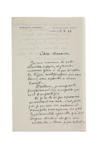 LUMIÈRE AUGUSTE (1862-1954), MÉDECIN ET BIOLOGISTE, COINVENTEUR DU CINÉMATOGRAPHE. L.A.S., Lyon 7 juillet 1943 ; 1 page et demie in-8 à son en-tête.