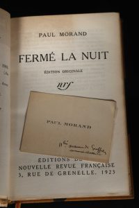 MORAND, Paul Lot de 3 ouvrages reliés : "Ouvert la nuit", 1922 ; exemplaire réimposé, numéroté, sur Lafuma Navarre. Dédicace et lettre manuscrite. "Fermé la nuit", 1923 ; un des 30 exemplaires hc, sur vélin Lafuma. Dédicacé, avec 2...
