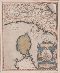 ORTELIUS, Abraham. Italia. Nord de l’Italie, Nord de la Sardaigne et la Corse au centre. 29 x 24 cm, ca 1570, sous cadre. Aquarellée, agréable décor, cartouche original.