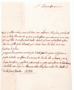 – L. s. [En italien], Calvy, 24 maggio 1757. 1 p. in-4°. Au sujet de la restitution de la somme de 400 lire à Monsieur Franzone… .