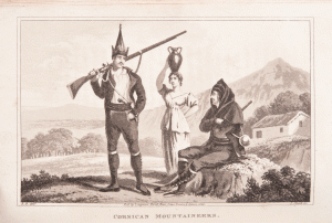 ♦ Bel ex. recherché entre autres pour ses 5 aquatintes d’une fine exécution, représentant Ajaccio, Corte, un groupe de montagnards corses (que l’on rencontre parfois en couleurs) le Ponte vecchio et la amison de Pascal Paoli.