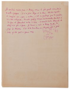 Texte autographe au stylo à bille rouge de Jean Cocteau à propos des Parents terribles et de ses comédiens. «Je considère Madame Yvonne de Bray comme la plus grande comédienne de notre époque...