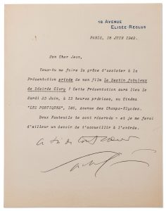 Lettre tapuscrite signée par Sacha Guitry dans laquelle il propose à Jean Cocteau d'assister à la présentation privée de son film Le destin fabuleux de Désirée Clary.