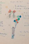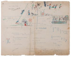 Textes préparatoires autographes du scénario sur papier quadrillé avec projets de dialogues à l'encre enluminés par de nombreux dessins originaux à l'encre tous rehaussés en couleurs par Jacques Prévert, l'ensemble au recto.