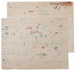 Deux planches autographes préparatoires du scénario avec projets de dialogues à l'encre sur papier quadrillé enluminé par de nombreux dessins originaux à l'encre, tous rehaussés en couleurs par Jacques Prévert.