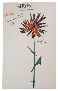 Éphéméride Jeudi, dessin original au feutre de couleurs représentant une grande fleur multicolore entourée de quelques notes autographes :