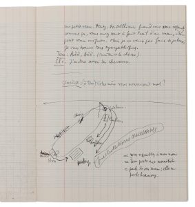 QUENEAU RAYMOND] (1903-1976). Mais n'te promène donc pas toute nue. Projet d'adaptation cinématographique de la pièce de Feydeau. Manuscrit autographe de 18 pages in-8 à l'encre sur cahier d'écolier avec ratures et corrections illustré de...